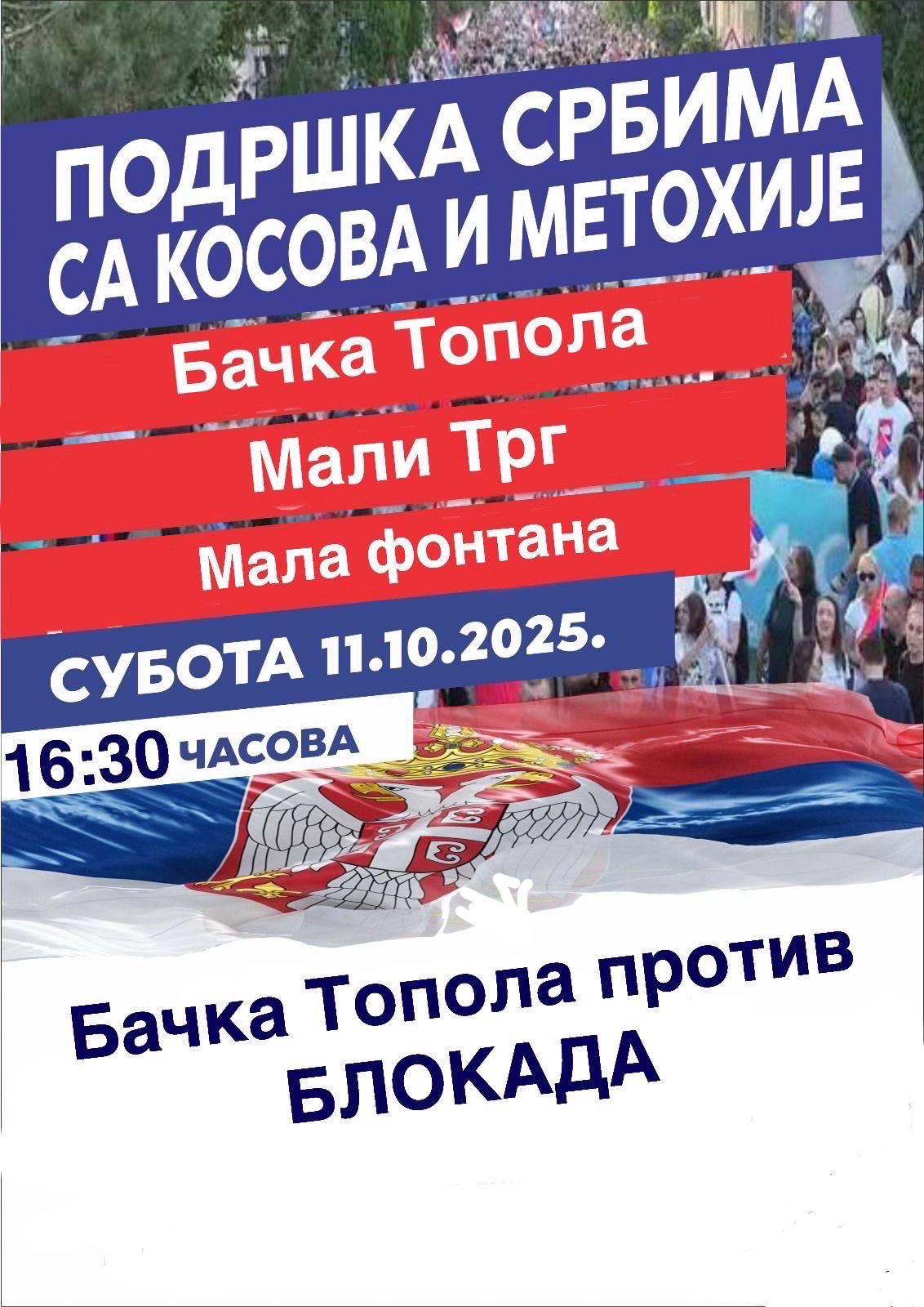 Sutra, 11. oktobra, na Malom trgu kod male fontane, održaće se skup građana „Bačka Topola protiv blokada“. Skup je zakazan za 16.30 časova, kada će građani ujedno pružiti podršku i Srbima sa Kosova i Metohije.